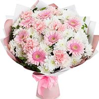 Нежный букет из хризантем и гербер. Цветовую гамму и оформление можно изменить по желанию.