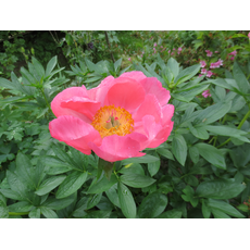 Эффектный пион кораллового оттенка с желтыми тычинками, обладающий нежным ароматом. Цветок может раскрыться до 15 см в диаметре. Яркий цвет делает этот сорт довольно самодостаточным, однако можно красиво сочетать его с кремовыми нежными некрупными цветами.