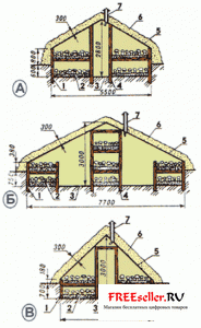 1 — деревянная стенка; 2 — фланк, или гряда; 3 — утрамбованный глиняный пол; 4 — деревянная стойка с перекладинами; 5 — двускатная деревянная крыша (при выгонке ранних овощей заменяется парниковыми рамами); 6 — теплозащита (слой конского навоза, забрасываемый зимой снегом); 7 — отдушина, или душник (деревянный короб с обитой войлоком задвижкой).